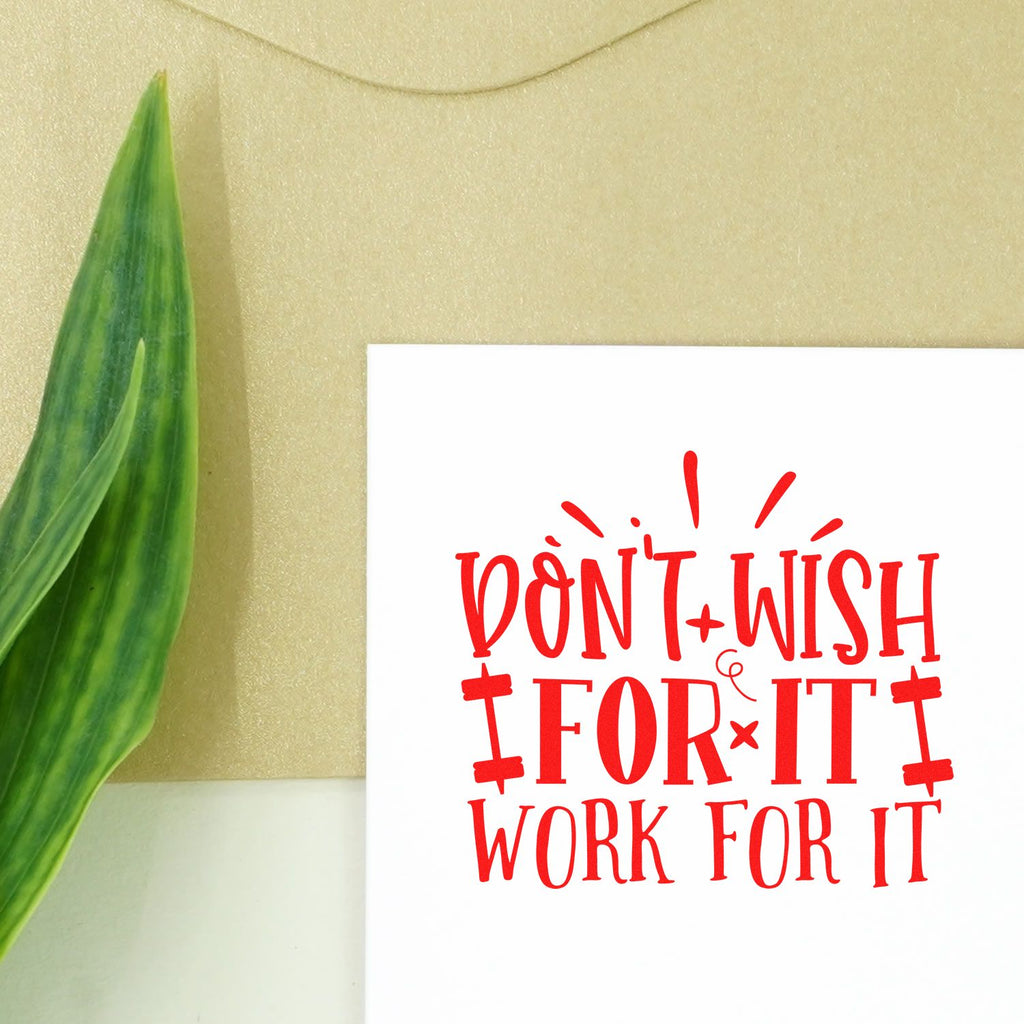 - Consistency: Bold black-and-white “DON’T WISH FOR IT WORK FOR IT” graphic with weight-bar accents prints legible, motivating designs that unify planners, promotional pieces, and merch.